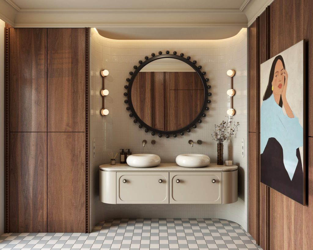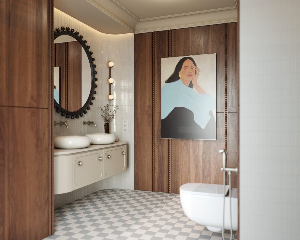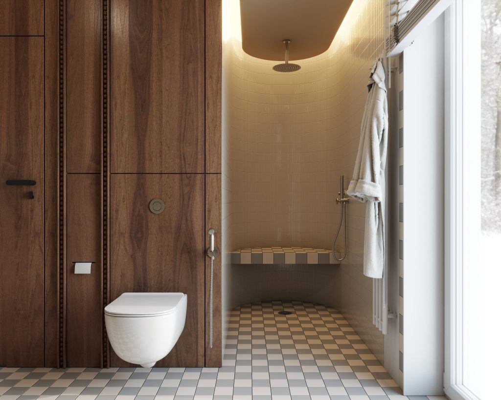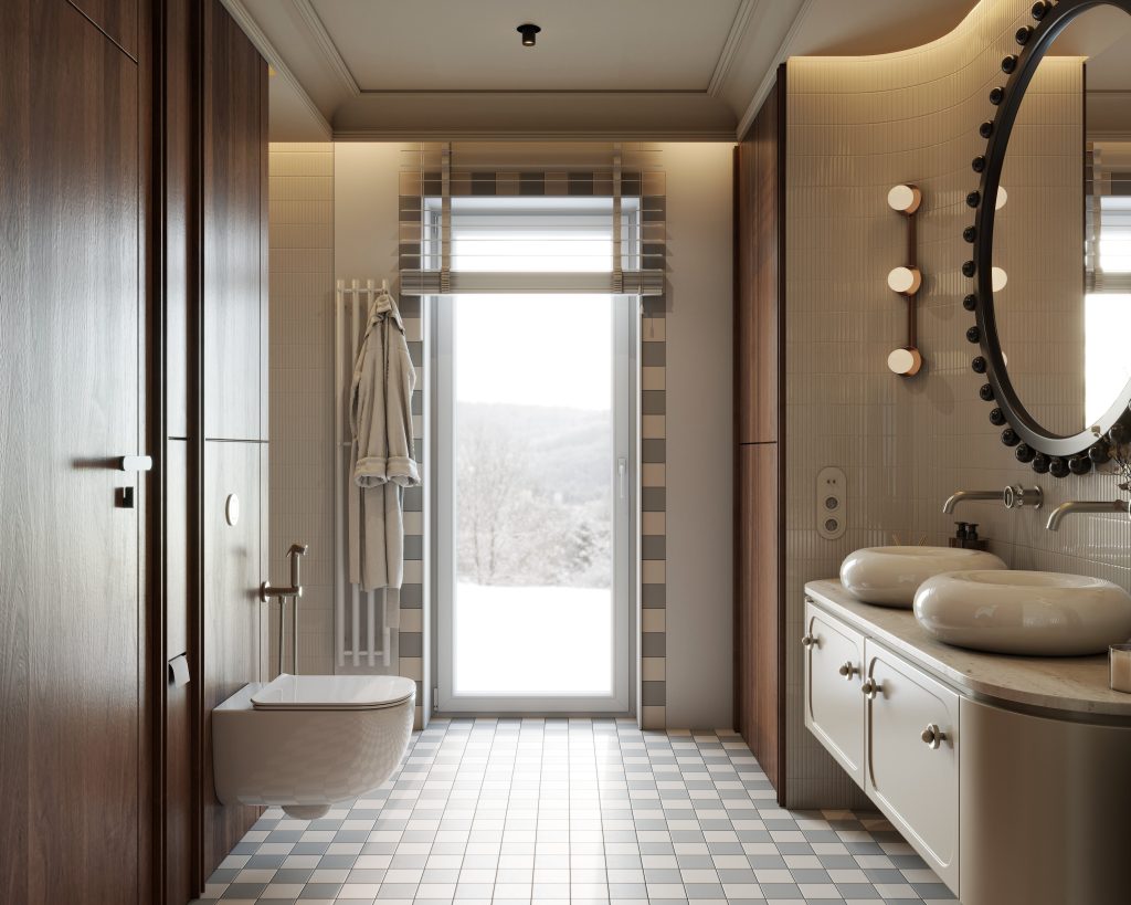 Łazienka o powierzchni 8,1 m² utrzymana jest w ciepłej, eleganckiej stylistyce łączącej nowoczesność z nutą modern classic. Zaprojektowana została dla młodego małżeństwa z Katowic, z myślą o codziennym komforcie i ponadczasowej estetyce. Jasne płytki, naturalne drewno oraz obłe formy ceramiki budują przytulny, harmonijny klimat sprzyjający wyciszeniu. Duże okno doświetla wnętrze i podkreśla naturalność zastosowanych materiałów, a wyraźny podział na strefę umywalkową i prysznicową zwiększa funkcjonalność przestrzeni. Całość opiera się na neutralnej palecie barw i klasycznych formach, dzięki czemu aranżacja pozostaje ponadczasowa. Zastosowane baterie z kolekcji Nebis spójnie dopełniają kompozycję i podkreślają elegancki charakter wnętrza.