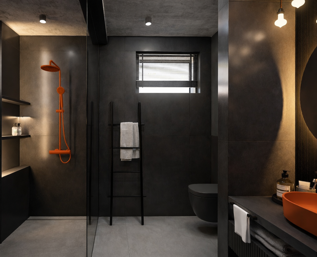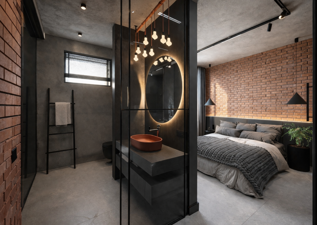 „Założeniem projektowym było stworzenie loftowej przestrzeni w ramach projektu nowoczesnej stodoły. Sypialnia główna została połączona z łazienką, tworząc otwartą, przenikającą się przestrzeń, w której funkcja i estetyka idą w parze. Ważne dla Inwestora surowe materiały, beton, cegła i czerń były punktem wyjściowym, to one zbudowały bazę i wyrazisty charakter wnętrza. Całość została świadomie przełamana akcentami koloru, które ocieplają kompozycję i nadają jej indywidualnego wyrazu. „