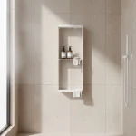 Dwupoziomowa półka prysznicowa w układzie pionowym, wykonana ze stali nierdzewnej i dostępna w kilku wykończeniach. Montaż możliwy tradycyjnie do ściany lub bezinwazyjnie na szybę, dzięki silikonowym osłonom zapewniającym ochronę szkła.