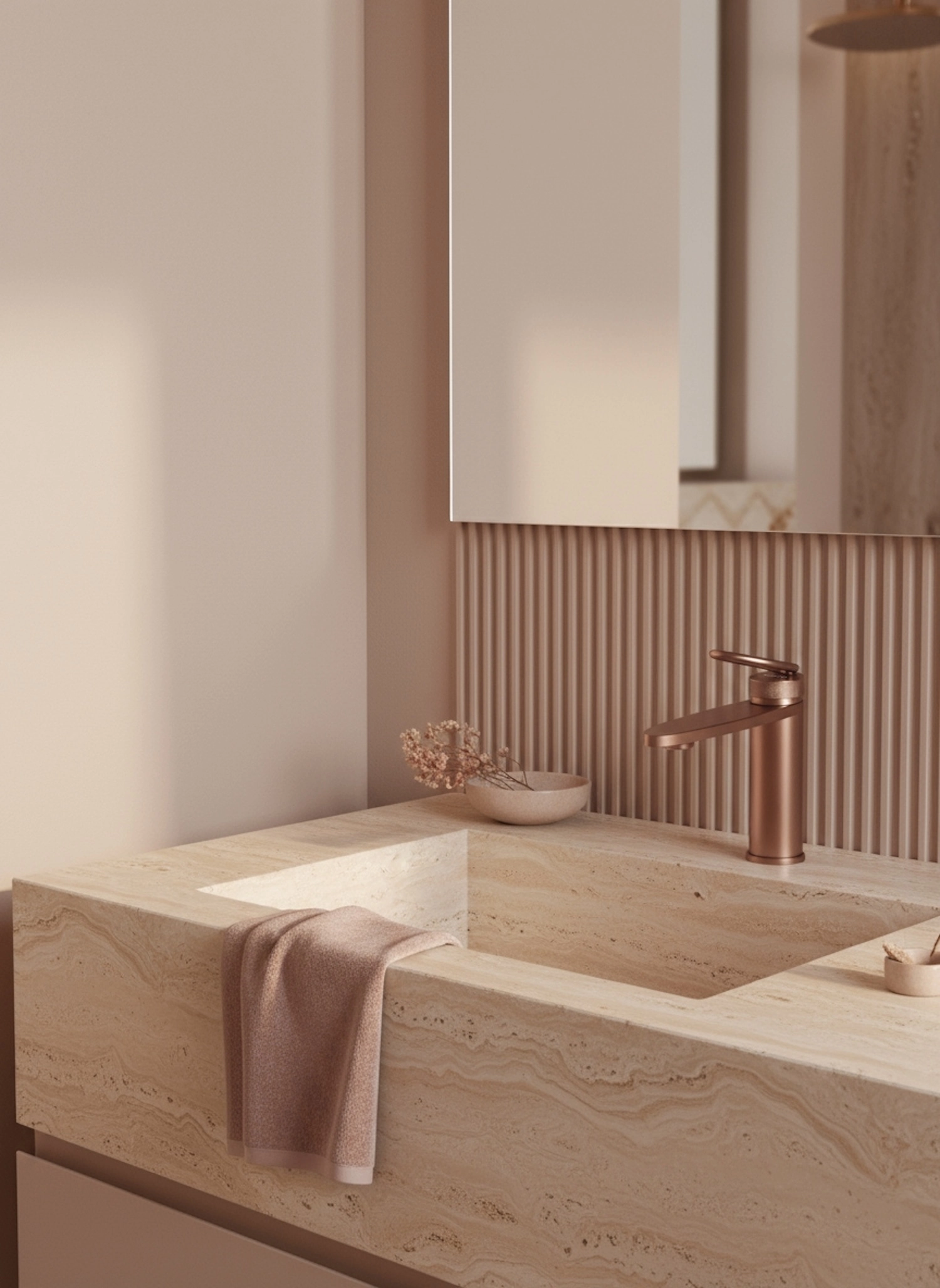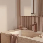 Forma baterii wywodzi się z przemyślanej geometrii – proste linie łagodnie przechodzą w zaoblone krawędzie, tworząc spójną, elegancką całość. Wewnątrz zastosowano TITAN-HEART™ Cartridge – niezwykle wytrzymałą głowicę ceramiczną. Korpus z mosiądzu pokryto powłoką DURACOAT™ Matrix, która chroni powierzchnię przed zarysowaniami i matowieniem, a HYDROPHOBIC+ Layer minimalizuje osadzanie się kamienia i ułatwia utrzymanie armatury w czystości. Z kolei AQUASTREAM™ Regulator gwarantuje stabilny, równomierny strumień.