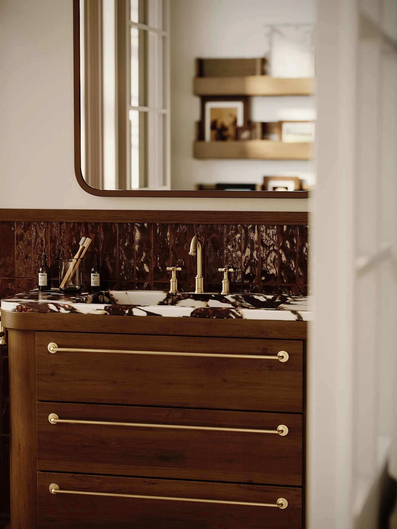 Dostępna w wykończeniu chrom lub szczotkowane złoto, pozwala precyzyjnie dopasować charakter armatury do indywidualnej preferencji.