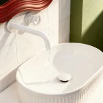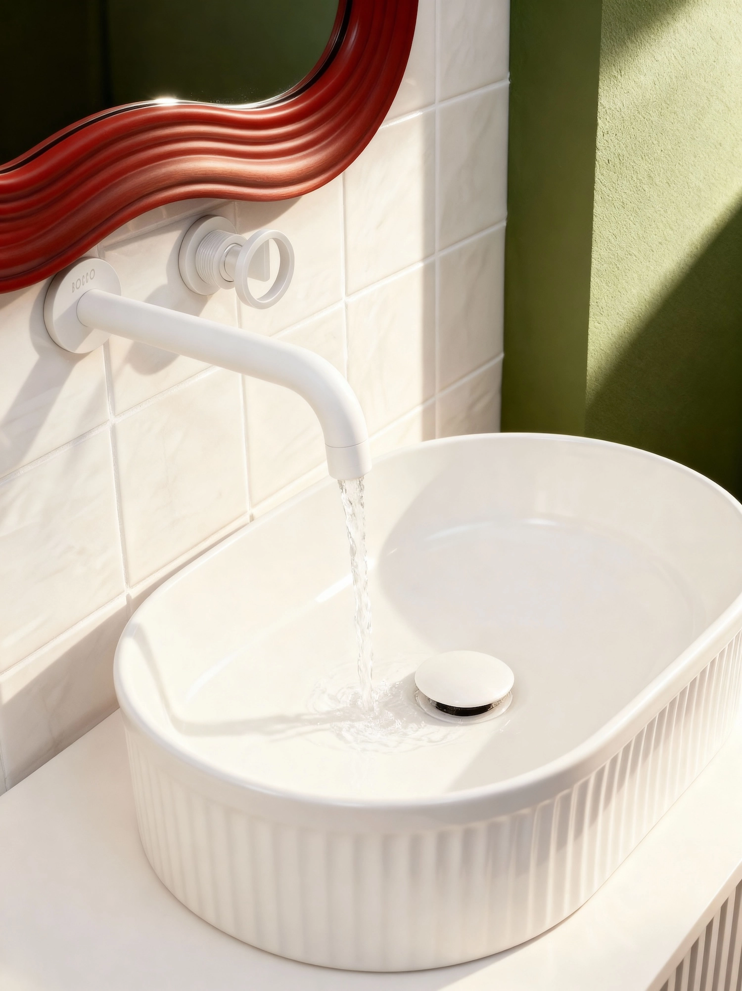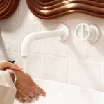 Podtynkowa bateria z kolekcji Nebis to dwuelementowy układ montowany na ścianie – z formą, która porządkuje przestrzeń.