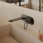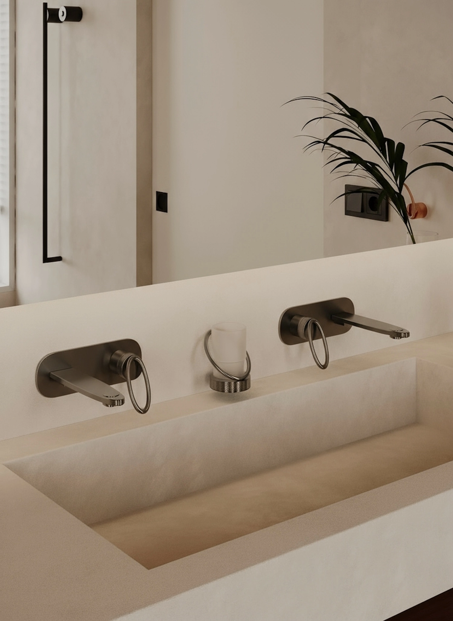 Bateria podtynkowa z kolekcji Essia, dzięki klarownej formie i subtelnie wyprofilowanemu uchwytowi, staje się integralną częścią architektury łazienki.