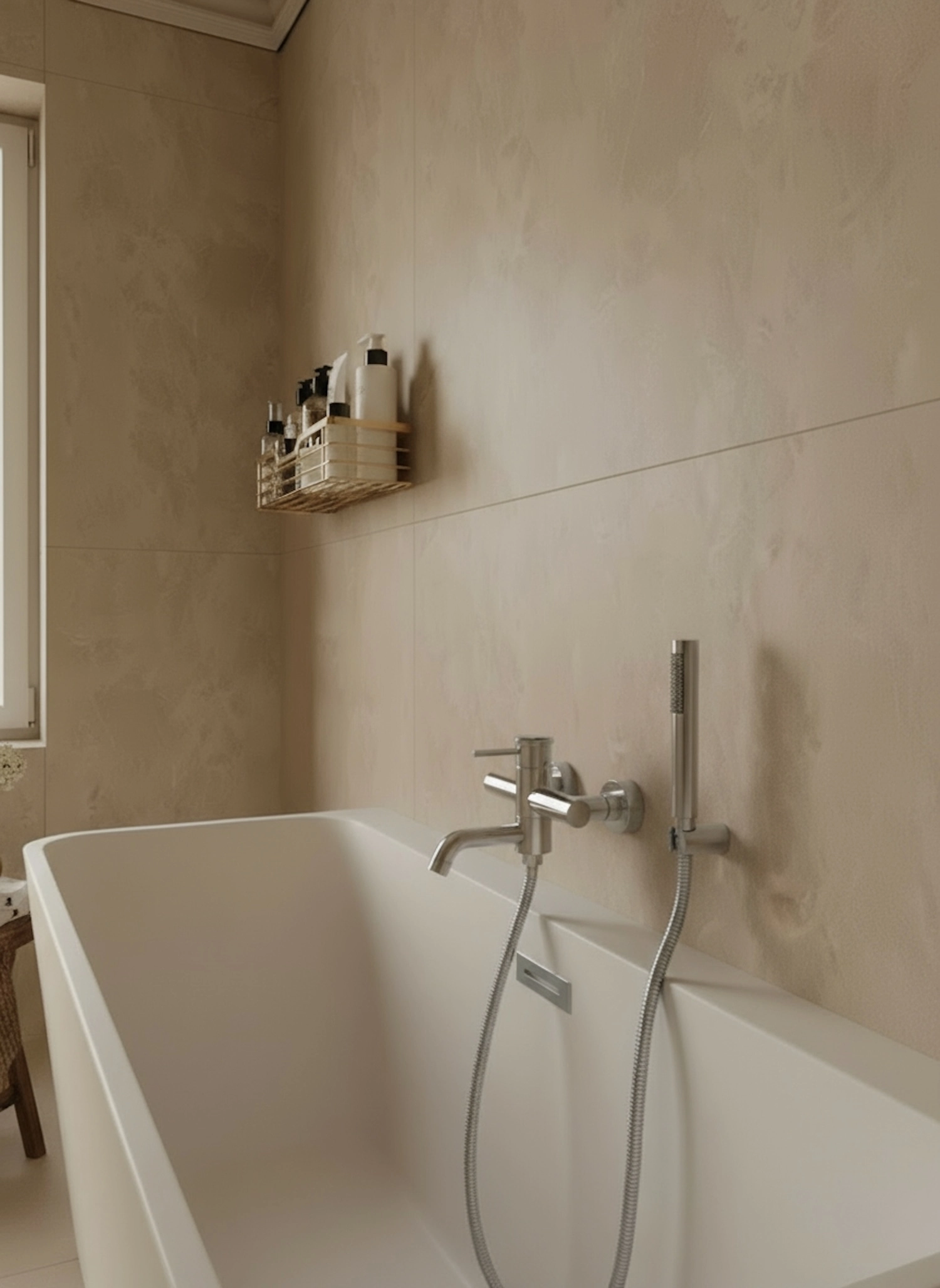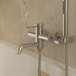 Bateria natynkowa ze słuchawką z kolekcji Liora łączy smukłą linię z dopracowaną ergonomią, tworząc praktyczną kompozycję przy wannie.