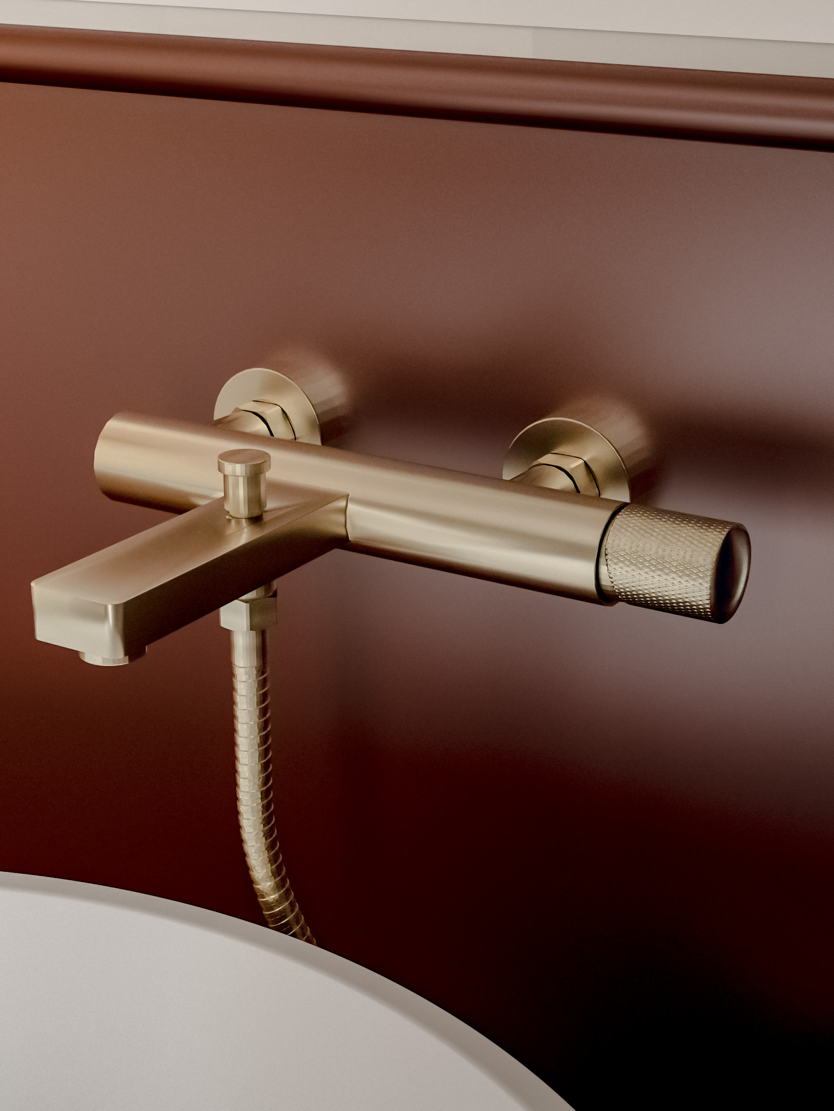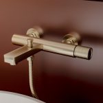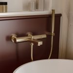 Bateria wannowa natynkowa ze słuchawką z kolekcji Vellum łączy wyważoną geometrię z charakterystyczną, żłobioną głowicą.