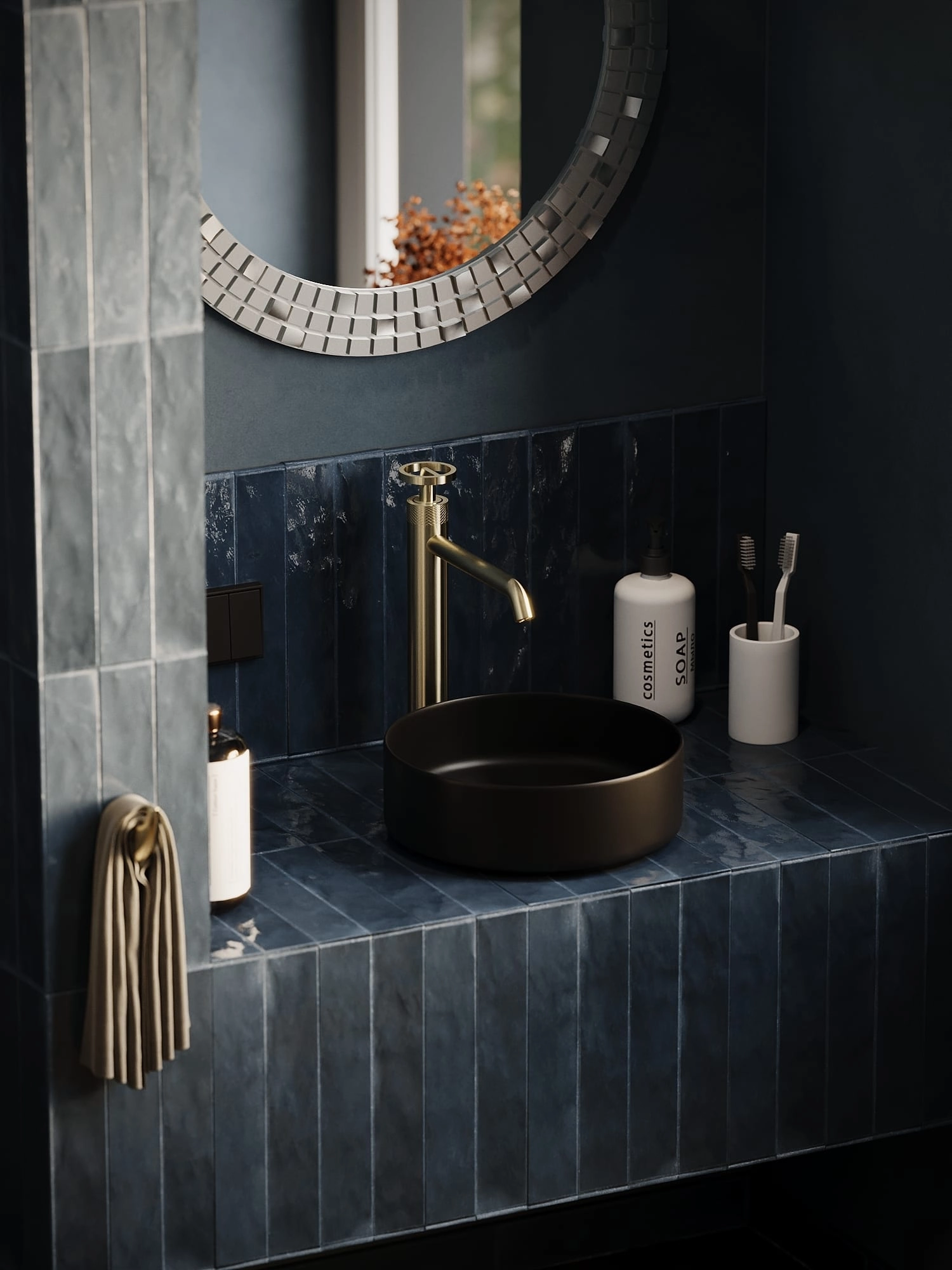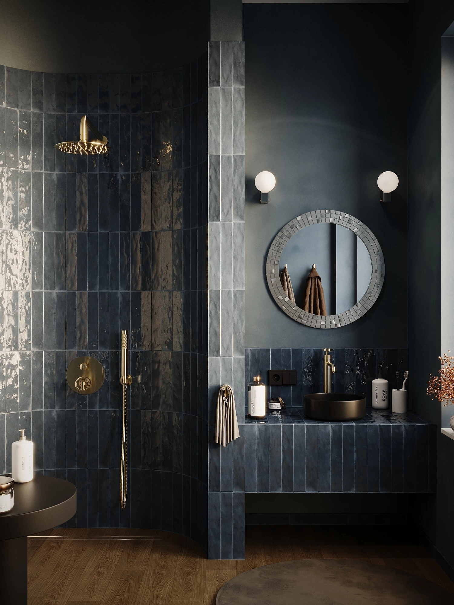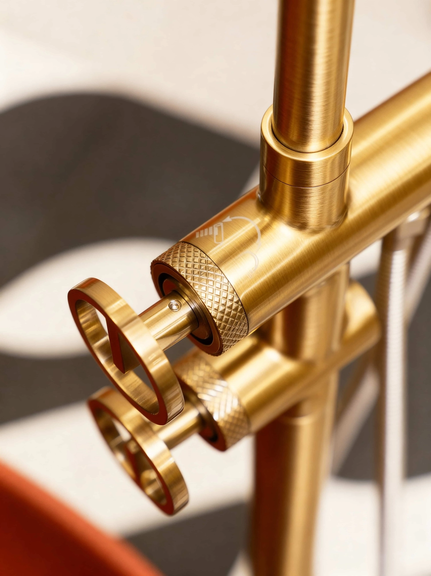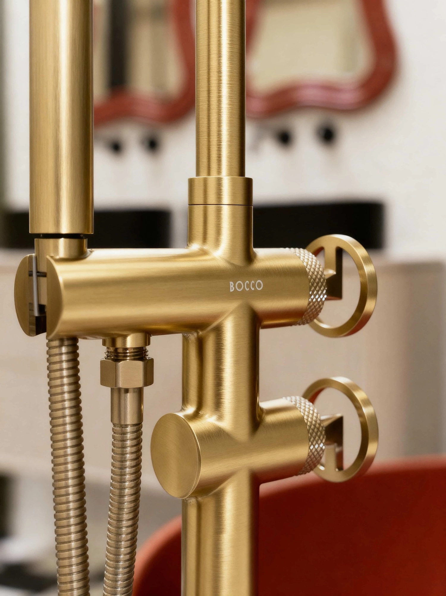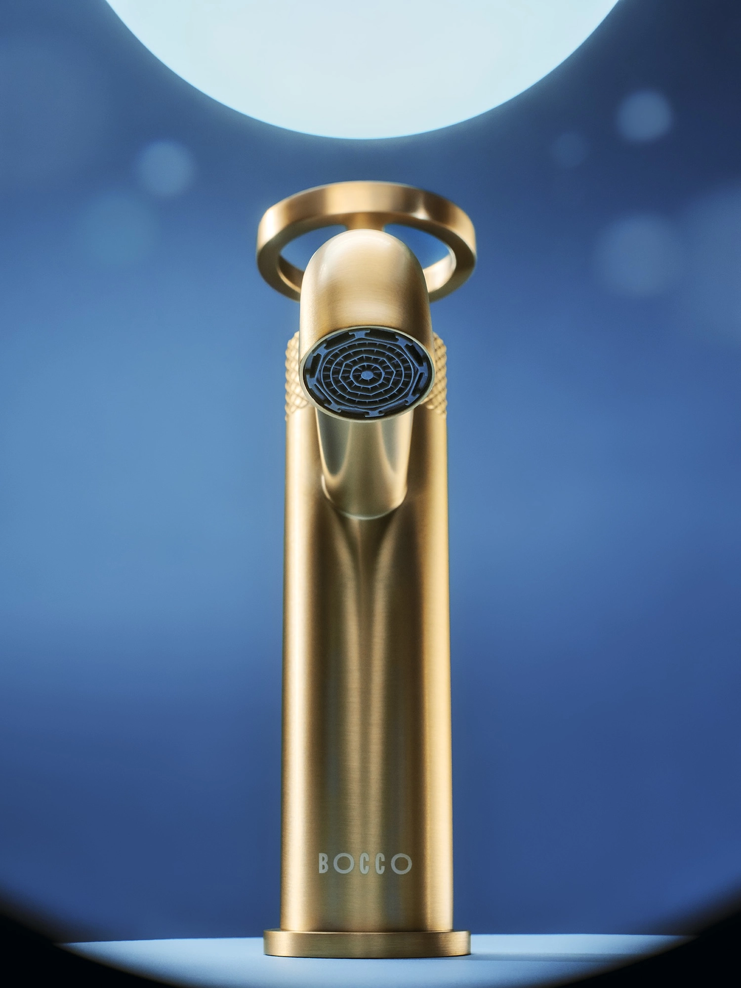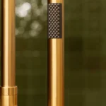 Bateria wannowa wolnostojąca z kolekcji Nebis opiera się na pionowej kolumnie z bocznym uchwytem i wylewką – całość utrzymana jest w języku geometrii charakterystycznym dla całej kolekcji.