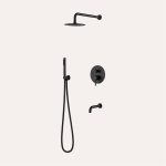 Zestaw tworzy kompletny układ strefy kąpielowej – obejmuje deszczownicę, słuchawkę prysznicową oraz wylewkę wannową, zapewniając pełną funkcjonalność w codziennym użytkowaniu. Podtynkowy montaż pozwala ukryć elementy instalacyjne i wyeksponować wyłącznie czystą, geometryczną formę armatury.