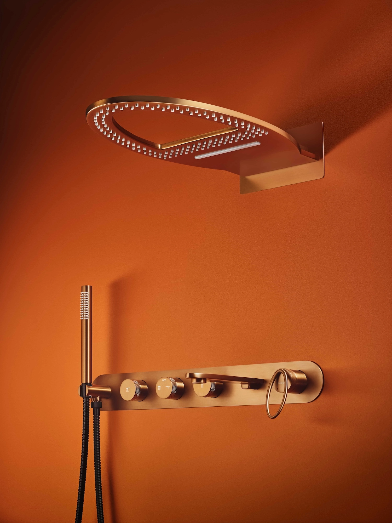 Deszczownica oferuje dwie niezależne funkcje: subtelny, otulający strumień z zewnętrznych dysz lub efektowny strumień wodospadowy, aktywowany jednym ruchem pokrętła.