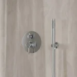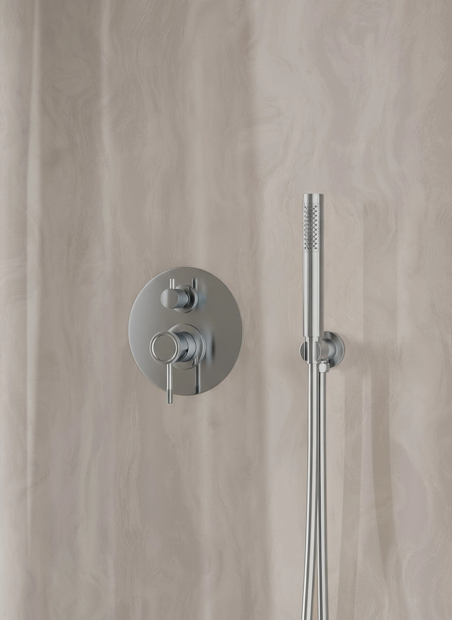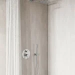 Zestaw prysznicowy podtynkowy z deszczownicą z kolekcji Liora bazuje na klarownej geometrii i starannie dobranych proporcjach, które porządkują przestrzeń strefy natryskowej.