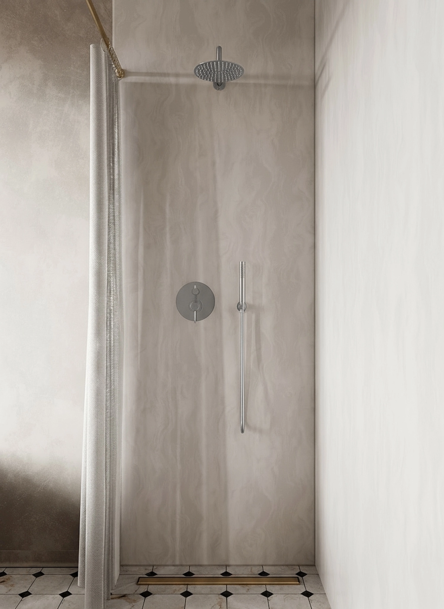 Dzięki starannie skomponowanej palecie wykończeń zestaw z kolekcji Liora pozwala subtelnie zintegrować funkcję prysznicową z rytmem wnętrza.