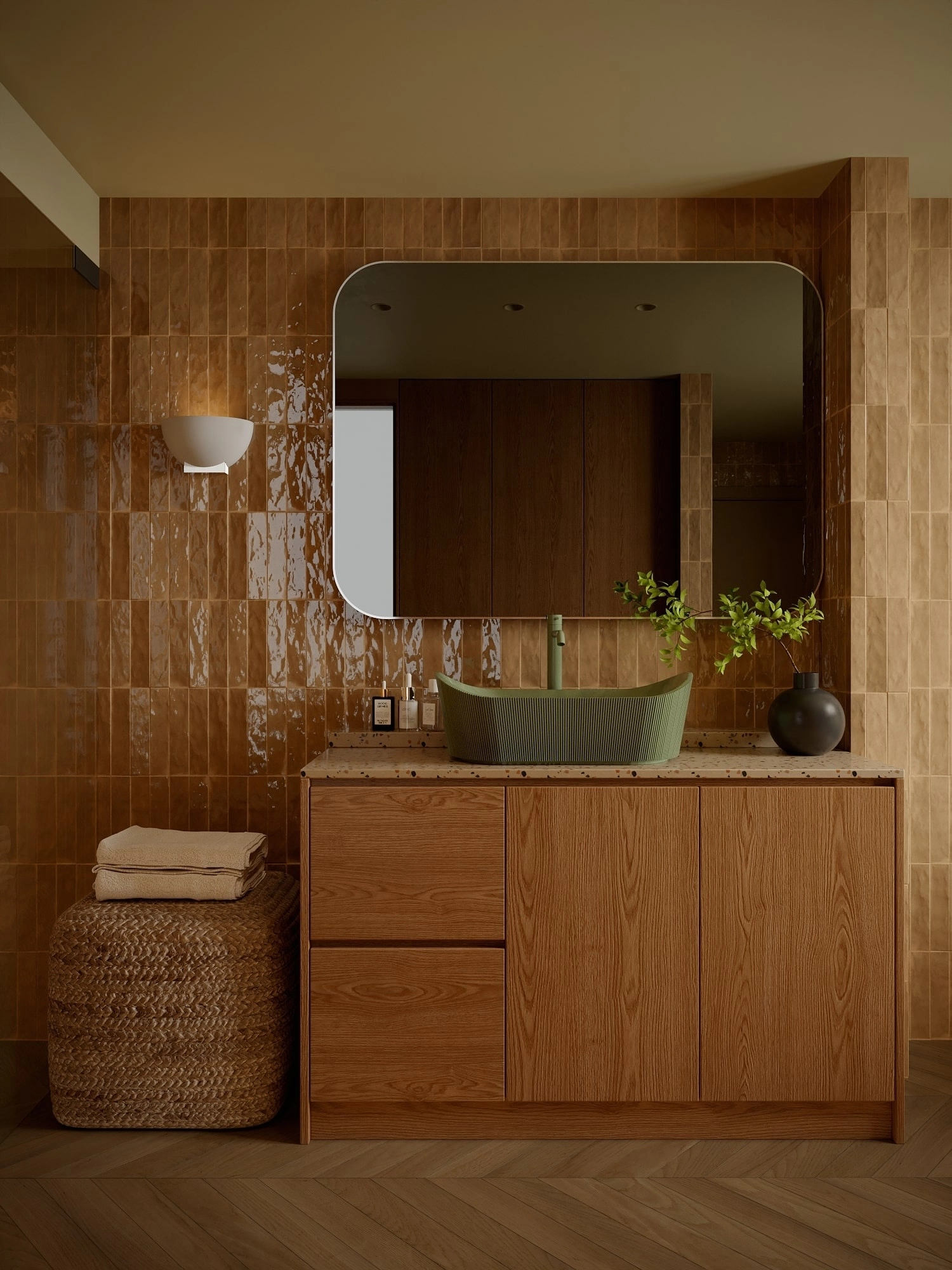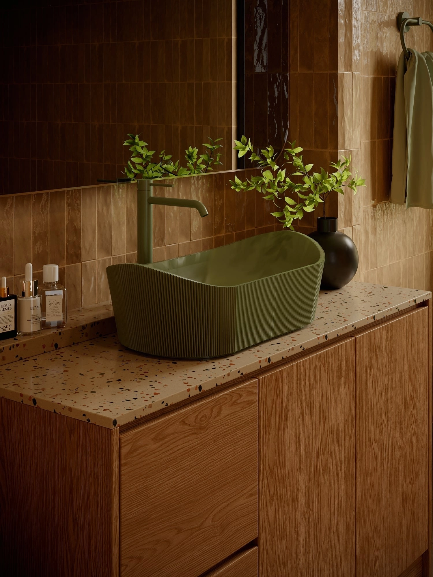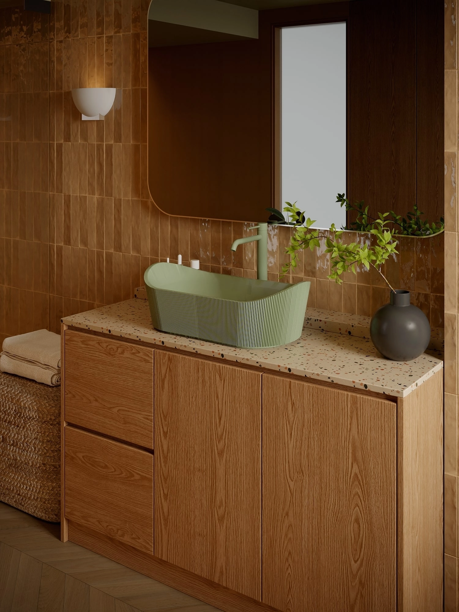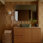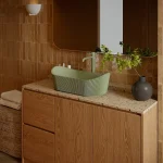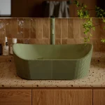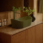 Umywalka z kolekcji Marea łączy nowoczesny design z odniesieniami do natury – strukturalna, subtelnie ryflowana powierzchnia zewnętrzna inspirowana jest kształtem kamienia lub falistą strukturą drewna.
