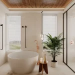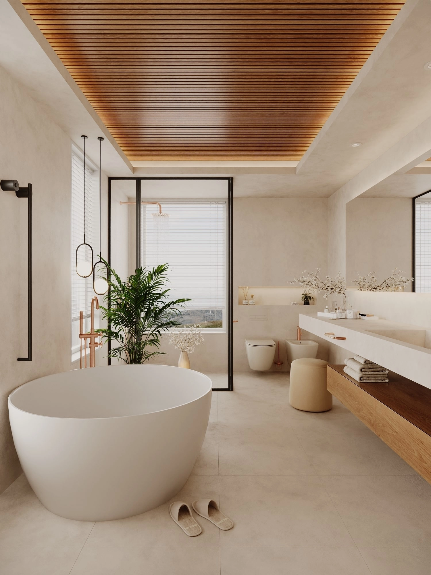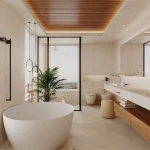 Wolnostojąca, okrągła wanna z kompozytu z kolekcji Marea – pełna, organiczna bryła zapewniająca komfortową kąpiel i doskonałą izolację cieplną.